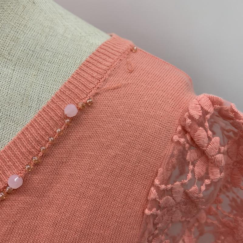 毛羽立ちが有ります。、首元のビーズが二か所取れています。、、肩幅:35、身幅:43、着丈:47、袖丈:18