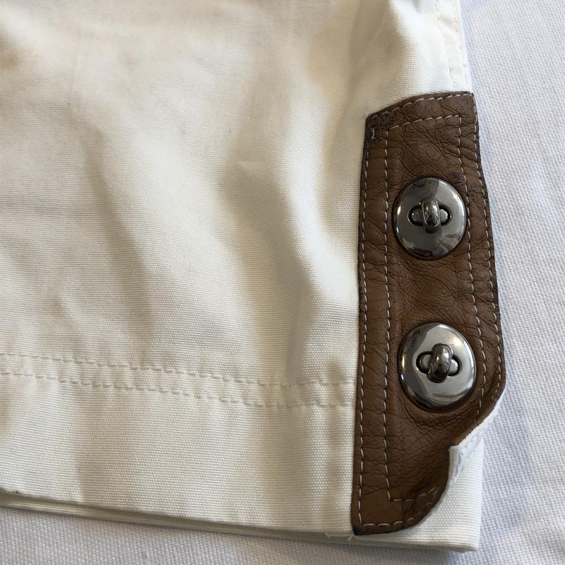 裾に目立つ汚れ、全体数カ所に小さな汚れ、レザーデザイン部分に目立つ汚れ、金具に変色、スレ