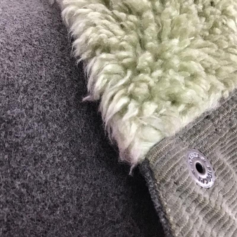 襟にピンク色の汚れがあります。、ボタンが錆びています。、袖口が擦れています。