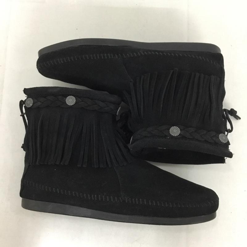 ミネトンカ Minnetonka ブーツ ショートブーツ Hi Top Back Zipper Boot 299 コンチョボタン フリンジ 8 FREE 無地 黒 / ブラック / レディース USED 古着 中古 10144921